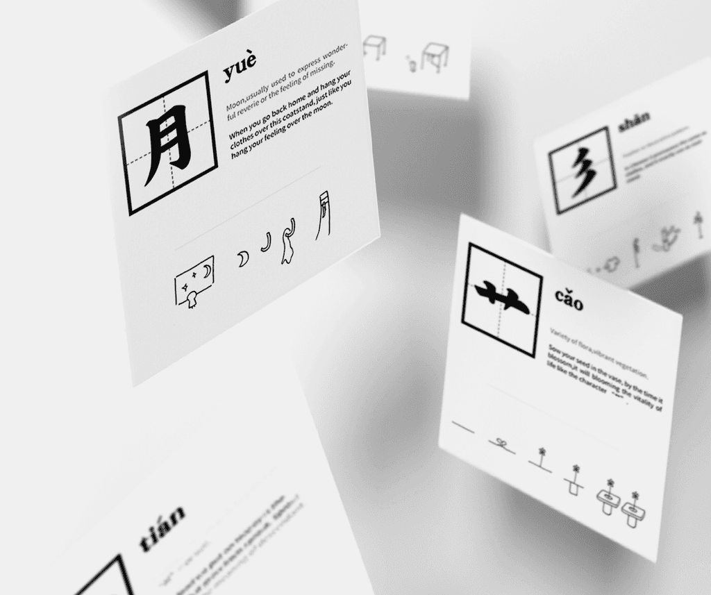 沿袭象形文字的理念,产品附带的说明书以简笔连环画的形式,展示汉字的字义和产品的语义,这种图形化的表达方式不仅作为一种跨越国界的语言,降低了理解成本,还为产品增添了趣味性