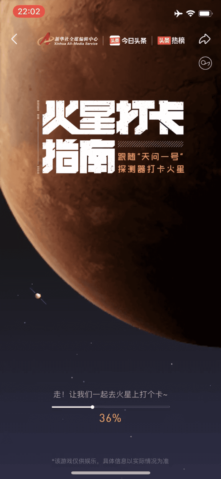以「火星打卡指南」包装天问一号着陆事件,配合新华社的宣发,低门槛、趣味性的小游戏可以在站外取得广泛的传播,是提升热榜品牌影响力的有效手段。